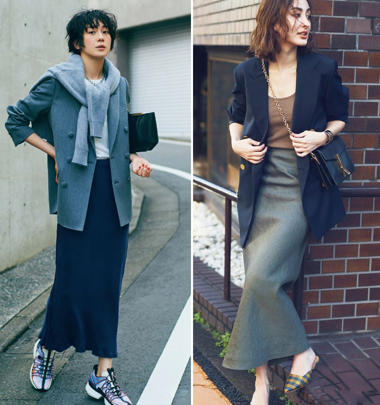 首先,我们分享的是利用小西装外套来搭配直筒版型的半身裙,宽松的小廓形小西装,与裹身的直筒半身长裙的组合,可以说是上松下紧的穿衣方式,在修饰身材的方面效果不错,能够帮助你营造出利落干练的氛围感。如果是用于职场通勤或者一些正式场合穿着,就要选择深色系的西装,会更容易穿出强大的气场范,脚上一双老爹运动鞋,可以弱化西装的刻板印象,让人感觉稍微放松一下。