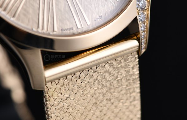 这枚腕表的表壳直径为36毫米,表盘采用Moonshine 18K金丝绸压纹设计,罗马数字刻度由Moonshine 18K金制成。