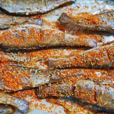 5、腌好的鱼放入烤盘,烤盘上记得垫锡纸,锡纸上可以刷一层油防粘